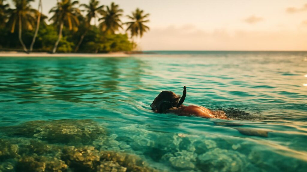 Nach und nach färbt sich die Lagune in immer intensivere Töne. Die ersten Sonnenstrahlen treffen auf das Wasser, und plötzlich verschwimmen die Grenzen zwischen Himmel und Meer. Wenn du die Augen schließt, hörst du das Knacken der Korallen unter den kleinen Wellen, das Platschen eines Fisches, das Klappern der Muscheln, die an den Bootskanten hängen. Es ist ein stilles, warmes Universum, das sich nicht anbiedert – du musst hineingehen, um es zu verstehen.