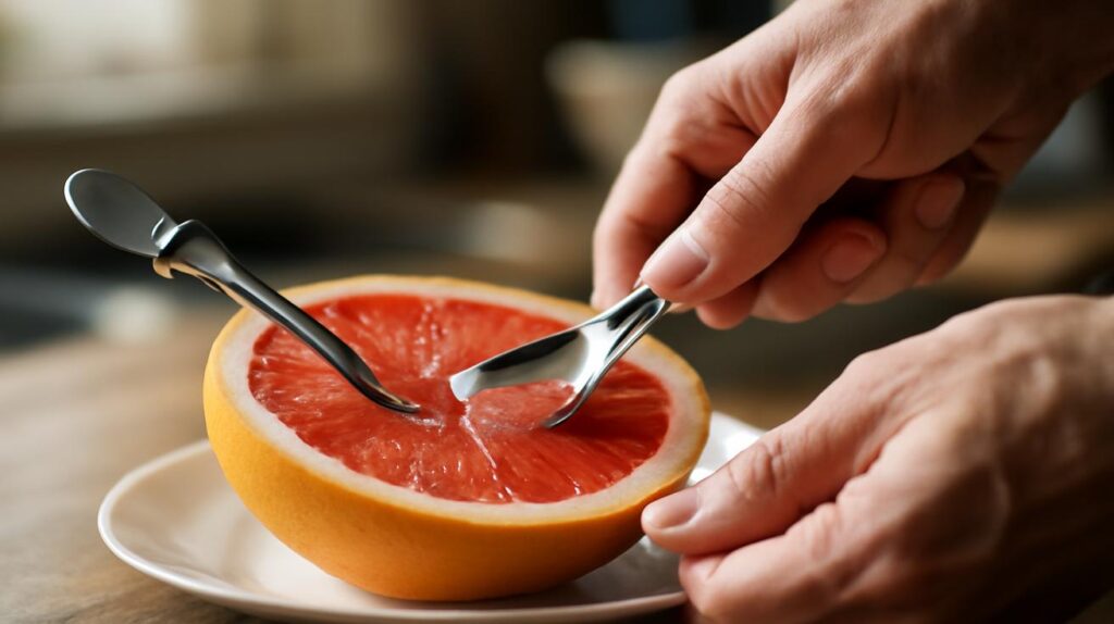 Zu Hause aber sah das bisher anders aus. Wer schon einmal versucht hat, eine Grapefruit mit einem normalen Löffel zu essen, kennt das Drama: spritzender Saft, glitschige Fruchtstückchen, eine klebrige Tischdecke und der vage Verdacht, dass da mehr Frucht im Spülbecken als im eigenen Magen landet. Man hantiert mit Messern, schabt mit Teelöffeln, dreht mit der Hand – und immer bleibt das Gefühl, diese Frucht wehre sich gegen den Verzehr.