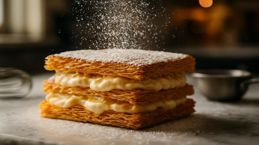 Der erste Biss klingt. Ein leises, verheißungsvolles Knacken, wenn die Gabel durch goldbraune Blätter von Blätterteig bricht. Ein Hauch von