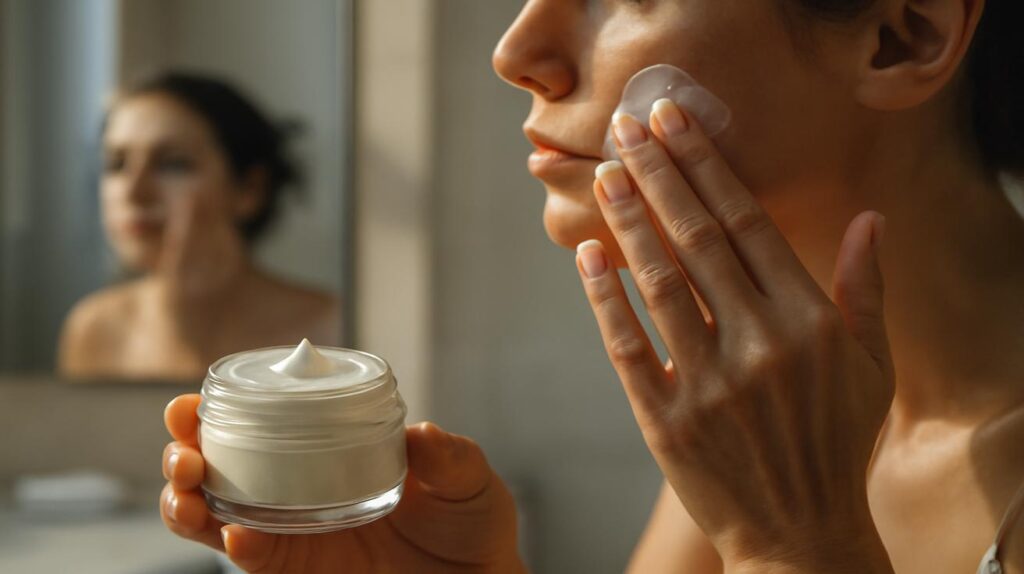 Die Creme liegt schwerelos auf ihrer Haut, wie ein Hauch von Morgendunst über einem stillen See. Draußen rauscht der Verkehr,